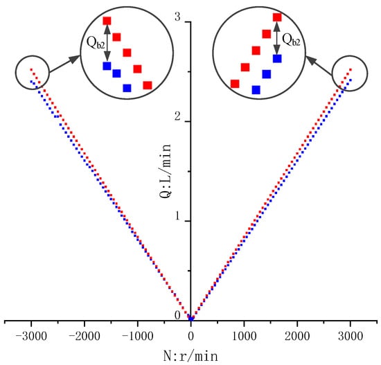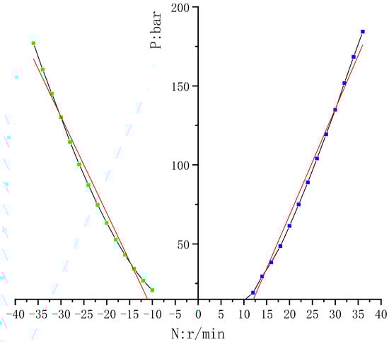 From the experimental results in the above figure, we concluded that when the system is running at no load, the output flow has a high degree of linearity, and the flow dead zone effect of the positive displacement pump is not obvious. The blue line in the figure is the theoretical output flow of the positive displacement pump, and the red line shows the actual output flow of the positive displacement pump. According to Equation (22), is the difference between the theoretical output flow and the actual output flow of the positive displacement pump, and the shear flow leakage of the axial piston pump has a linear relationship with the pump speed. We calibrated the formula through experimental data.
