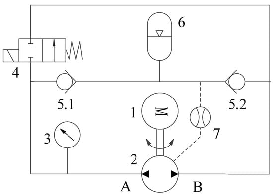 Schematic diagram of the dead zone pressure building experiment. 1: servomotor; 2: positive displacement pump; 3: pressure gauge; 4: solenoid directional valve; 5.1/5.2: check valve; 6: accumulator; 7: flow sensor.