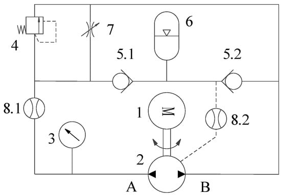 Experimental hydraulic schematic diagram of load zone. 1: servomotor; 2: positive displacement pump; 3: pressure gauge; 4: relief valve; 5.1/5.2: check valve; 6: accumulator; 7: throttle valve; 8.1/8.2: flow sensor.