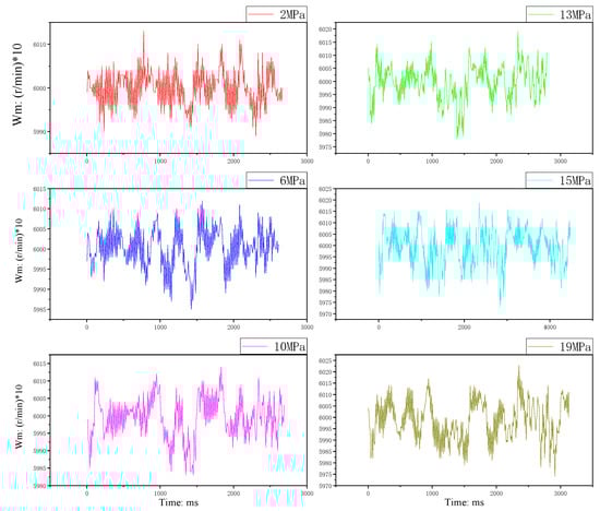 To verify the relationship between the internal friction of the SM and the speed fluctuation of the SM, an experiment on the speed fluctuation under the same load and different speeds was carried out. The experimental data are shown in Figure 13. To more intuitively reflect the rotational speed under different speed conditions, the standard deviation of the data was used, as shown in Table 4 below: