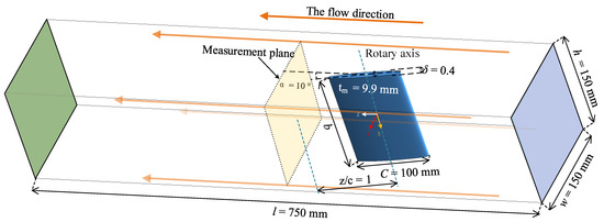 In this paper, the NACA0009 hydrofoil is selected for numerical simulation based on the previous experimental basis [33], and a three-dimensional model is established according to the experimental conditions, of which the model structure is shown in Figure 1. The basic parameters of the geometric model are as follows: the total length of the water tank l is 750 mm, the distance from the inlet to the leading edge of the hydrofoil is 200 mm, the distance from the outlet to the trailing edge of the hydrofoil is 450 mm, the width of the water tank w is 150 mm, the height of the water tank h is 50 mm, the chord length of the hydrofoil c is 100 mm, the span of the hydrofoil b is 146 mm, and the maximum thickness of the hydrofoil is 9.9 mm. The attack angle of the hydrofoil α is 10°, the incoming flow velocity W∞ is 10 m/s, and the tip clearance δ is 0.4 mm.
