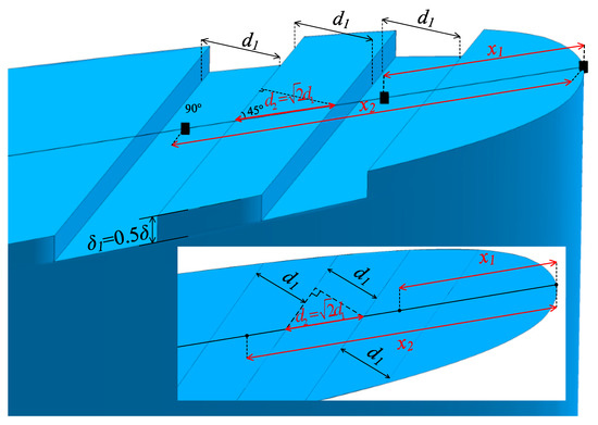 Due to the different locations of the primary tip leakage vortex (PTLV) and secondary tip leakage vortex (STLV) [38], a single groove can block only one kind of the TLV, while too many grooves can drastically affect the performance of the hydrofoil. Therefore, a parallel grooves structure is proposed in this paper, and the location of the groove is mainly concentrated at 5–30% of the chord length, the location where the tip leakage vortex is mainly generated. The shape of the single groove is a linear groove, the inclination angle of the groove is 45°, the depth of the groove δ1 is half of the tip clearance, the vertical length of the groove d1 is 3 mm, and the maximum length of the groove boundary d2 is d1, which is 1/23c. The distance between the center of the first groove and the leading edge is x1, and the distance between the center of the second groove and the leading edge is x2.