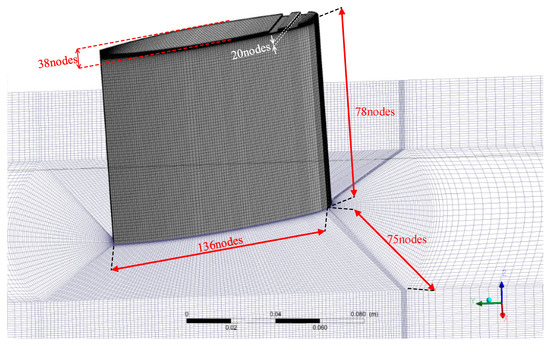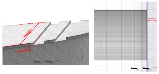 The details of node distribution of Mesh3 are represented in Figure 3. To improve the quality of the mesh, the surrounding grid of hydrofoil is treated with an O-block topology [39], and the mesh layer on the hydrofoil surface is 73, with y+ values between 1–10 on the hydrofoil. Since the study in this paper focuses on the TLV and to capture the TLV structure as accurately as possible, the mesh of tip clearance is refined with 58 layers. The presence of the groove structure leads to the emergence of a nascent groove leakage vortex (GLV) inside the groove. In order to observe the development of the GLV, the interior mesh of the groove is refined with 20 layers. Furthermore, 138 layers are arranged along the chord length of the hydrofoil, and 78 layers are sped along the span of the hydrofoil.