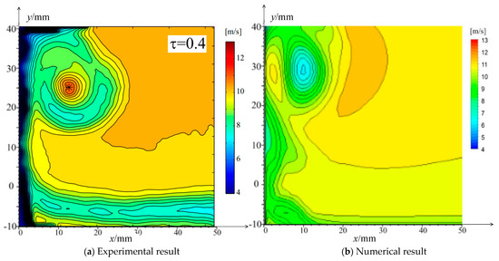 Meanwhile, in order to intuitively compare the error range in more detail, the velocity contour of the cross-section z/c = 1 are selected in this paper. As can be seen in Figure 5a,b, the numerical simulation is relatively successful in predicting the basic positions of the high-speed region and the low-velocity region. Although there is a certain error between the numerical simulation and the experimental results, which may be caused by the fact that the surface of the hydrofoil in the experiments is not absolutely smooth, but the error range is not large, therefore it is convinced that the accuracy of the SST k-ω turbulence model is verified.