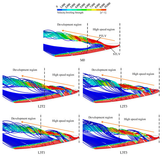 Additionally, the vortex intensity of PTLV and STLV with parallel grooves is remarkably reduced both around the hydrofoil and tip clearance. The trajectory of the PTLV in M0 is marked by the orange dashed line in the figure, and it can be seen from L2T2, L2T3, L3T1, and L3T3 that the position of the vortex core in each cross-section is not significantly shifted, and the presence of the parallel grooves does not change the trajectory of the PTLV, but expands the vortex range. It can be assumed that the presence of parallel grooves makes the structures of PTLV and STLV diverge, thus suppressing the TLV.