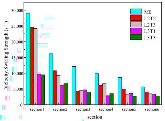 Figure 9 shows the swirling strength comparison of the vortex core in the six cross-sections within (b), (c), (d) and (e). It is obvious from the figure that the presence of the parallel grooves reduces the swirling strength of vortex core in each section compared with the M0. The scope of this effect is mainly focused on the front position of 30%c of the hydrofoil, among which the effect on Section 1 of L3T1 and L3T3 is the most prominent. The effect of the groove on the swirling strength is the smallest when the cross section is at 40%c position. Among the four configurations, the best comprehensive effect of vortex core swirling strength reduction is L3T1.