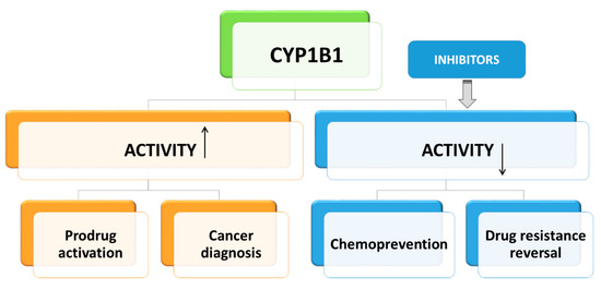 Regarding its functions in cellular metabolism, CYP1B1 is considered as a target in cancer chemoprevention and therapy (Figure 2). Cancer chemoprevention is the strategy to prevent or delay the initiation, promotion, or progression of cancer disease with the use of natural compounds or their synthetic derivatives. Progress of cancer depends on the activation of pathways leading to inflammation and angiogenesis [50,51,52]. Many phytochemicals exert anti-inflammatory and anti-angiogenic activities [53,54,55]. Most of these compounds, like flavonoids, furanocoumarins, chalcones, stilbenoids, anthraquinones, and alkaloids, are also potent and specific inhibitors of CYP1B1 activity [56,57]. Thus, the association of CYP1B1 with the inflammatory process and angiogenesis is suggested. Therefore, the use of CYP1B1 inhibitors targeting both cancer cells and their microenvironment, including neutrophils, macrophages, lymphocytes, and fibroblasts, is supposed to be a promising strategy in chemoprevention [58]. CYP1B1 may contribute to the cytotoxicity of natural compounds against cancer cells and cancer stem cells resistant to chemotherapy [59,60].