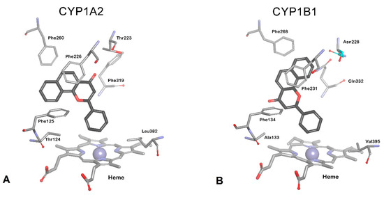 Orientation of ANF in: (A) CYP1A2 (PDB id: 2hi4) and (B) CYP1B1 (PDB id: 3pm0). ANF (rendered with black carbon atoms), heme, and residues are presented as stick models in atom type.