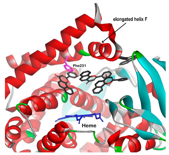 According to the size and shape of the binding site cavity, relatively small and planar molecules as polycyclic aromatic hydrocarbons (PAH), stilbenes, flavonoids, and anthraquinones are substrates/inhibitors of CYPs family1 [80,81]. Structure-based drug design requires detailed knowledge of active-site interactions with potential ligands. In studies of substrate-enzyme interactions, computational methods, particularly long-term molecular dynamics simulations, that identify the subtle changes of molecular conformations provided the elucidation of how non-planar substrates might be accommodated in small CYP’s binding sites. Currently used bioinformatics tools are briefly discussed in Section 3.5. The studies on CYP1A1 molecular structures revealed that the accommodation of the substrates with higher molecular weight and non-planar structure in the enzyme binding site is possible due to conformational changes of the side chains in the enzyme cavity [75,76].