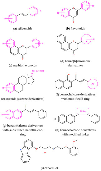 Core structures (scaffolds) used in the design of selective CYP1B1 inhibitors: (a) trans-stilbene derivatives; (b) flavone derivatives substituted in A and B rings, (c) α-naphtoflavone derivatives with B and D ring modifications; (d) benzo[h]chromone derivatives with various B-ring (X) structures; (e) pyridine-, 3-thio- and 2-aryl-estrane derivatives; (f) benzochalcone derivatives with modified B ring; (g) naphthalene ring-substituted benzochalcones; (h) linker modified benzochalcones; (i) carvedilol as a novel CYP1B1 inhibitor found in structure-based virtual screening.