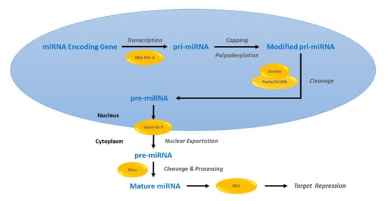 miRNAs exist as antisense single strands to target genes, negatively regulating their expression post transcription. Genes encoding miRNA are transcribed into primary transcripts (pri-miRNA), which are several kilobases in length, by the enzymatic activity of RNA polymerase II within the nucleus, and which are then subjected to capping and polyadenylation, as depicted in Figure 1 [5,6]. These pri-miRNAs are shortened to form precursor miRNA molecules (pre-miRNA) by the action of Drosha, an enzyme belonging to the RNA polymerase III family, in a complex with DCGR8/Pasha and then exported to cytoplasm via exportin-5. Further cleavage by Dicer, another RNA polymerase III enzyme, and degradation of the complementary strand generates shorter single-stranded RNA molecules, referred to as mature miRNA [7]. The final form, as part of the RNA-induced gene silencing complex (RISC), binds to its complementary mRNA sequence and targets it for degradation or negative regulation at the protein translation level [8]. Hence, miRNAs serve as a critical component for transcriptional gene silencing.