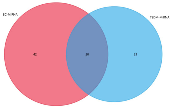 In continuation with this, the miRNAs discussed earlier in this review, i.e., 53 for T2DM and 62 for breast cancer, were utilized to identify a 20-miRNA signature that is common to both T2DM and breast cancer by employing a Venn diagram analysis performed on Funrich software [209], as shown in Figure 2.