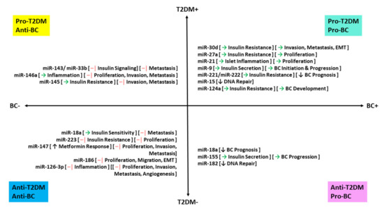 Hence, out of the 20 miRNAs identified, previously published literature has already discussed 6 of these miRNAs in the context of the T2DM–BC dual relationship. As for the remaining 14 miRNAs, relating the expression patterns of each of these for either disease may provide clues into their potential role in mediating the phenotypic changes underlying the T2DM–BC crosstalk, as illustrated in Figure 3.