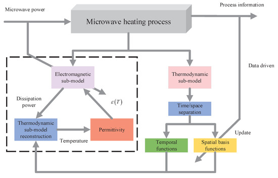 The microwave heating model can be divided into electromagnetic and thermodynamic sub-models. As we know, it is difficult to obtain the dominant dynamic characteristics of electromagnetic propagation due to the form of time-harmonic oscillations for the microwave propagation. Besides, the electromagnetic boundary condition also implies that it is impossible to transform the Maxwell’s equations into a simpler expression. Fortunately, the traditional time/space separation method can effectively reduce the complexity of thermal sub-model because the spatiotemporal parameters can be approximated as the Fourier series. By using Galerkin method or approximated inertial manifold method, the spatial basis functions can be truncated or updated in order to facilitate the model reconstruction. However, the mixed boundary conditions make the spatiotemporal parameters difficult to separate. Therefore, a data-driven method will be used for obtaining the empirical eigenfunction and reconstructing the thermodynamic sub-model. By combining the relationship between the electromagnetic and thermodynamic fields on the microwave heating process, we present the general framework of data-driven based spatiotemporal model reduction, which can be shown in Figure 1.