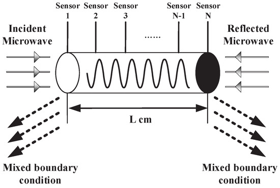 where . It is obvious that (38) has transform the temporal differential operator, spatial differential operator and mixed boundary conditions into the matrix formulations. As Figure 2 shown, N sensors are uniformly placed to measure the N temperature rise curves. By implementing the open-loop simulation of (4), (29), (30), (38), the snapshots of microwave heating Debye media can be obtained. On the assumption the sampling times is chosen as M, the snapshots can be expressed as the ensemble of , which can be defined as