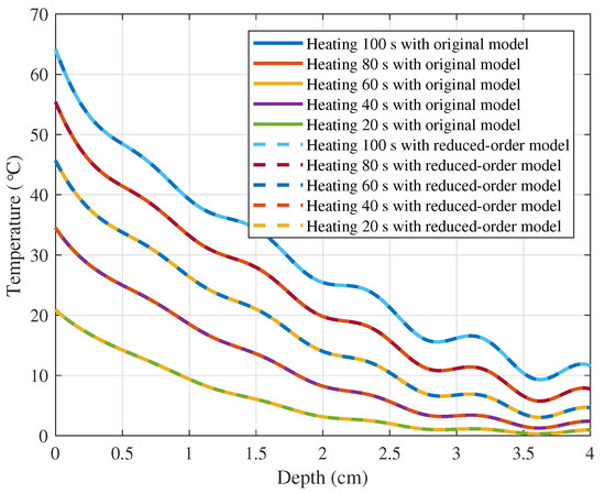 Comparison between the reduced-order model and original model for the temperature rise curves at , , , and .