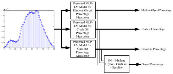 Three optimized ANN models were obtained in order to measure ratios of ethylene glycol, crude oil, and gasoline, respectively. The gas to oil ratio could then be obtained as a difference by the previous percentages. The optimized ANN model for measuring ethylene glycol percentage has one hidden layer with six neurons and 850 epochs. The optimized ANN model for measuring crude oil percentage has one hidden layer with five neurons and 550 epochs. The optimized ANN model for measuring gasoline percentage has one hidden layer with nine neurons and 800 epochs. “Logsig” was the activation function of hidden layer neurons of the first and second models, and “Tansig” for the third model. Figure 3 illustrates the proposed procedure in order to measure the volume percentage of petroleum products.