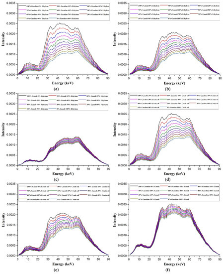 The photon energy spectra recorded in the detector for the six various mixtures in different volume ratios in the range of 0–100% with a step of 10%: (a) ethylene glycol and gasoline; (b) ethylene glycol and gasoil; (c) ethylene glycol and crude oil; (d) crude oil and gasoline; (e) crude oil and gasoil; and (f) gasoil and gasoline.