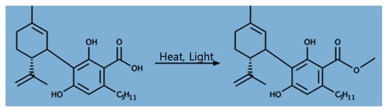 - Eichler, M.; Spinedi, L.; Unfer-Grauwiler, S.; Bodmer, M.; Surber, C.; Luedi, M.; Drewe, J. Heat exposure of Cannabis sativa extracts affects the pharmacokinetic and metabolic profile in healthy male subjects. Planta Med. 2012, 78, 686–691. [Google Scholar] [CrossRef]