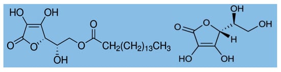Chemical structure of ascorbyl palmate (left) and L ascorbic acid (right).