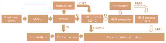 The formulated hemp leaves were put into the HME feeding hopper at a feeding rate 50–100 g/min (feeder speed 10–15 rpm), and water was added to the HME barrel at 60–70 mL/min using an auto electric pump (Festina Namsung Co., Seoul, Korea). The HME conditions were as follows: low shear, screw speed of 1000 rpm, barrel temperature of 80–90–120 °C, and an extruder plate die of 3 mm. The HME configuration was as follows: model FX40 Extruder (Festina FX40 Namsung Co., Seoul, Korea); main motor with 14 KW; feeder motor with 1.5 KW; production capacity of 80 kg/h; twin screw and screw speed of 1750 rpm (max); screw diameter of ϕ44 × 860 L; power supply of 200–400 V ± 10%/60 Hz; HME sizes of W-1200, L-1900, and H-1800; and a total machine weight of 1 ton. The steps for the entire decarboxylated process are depicted in Figure 3.