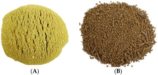 The collected extrudate materials were dried in an oven at 50 °C for 24 h. The dried materials were kept in an airtight bag and store at 4 °C in the refrigerator for further use. The morphology of the fresh hemp leaf powder and extrudate decarboxylated hemp leaf powder is shown in Figure 4.