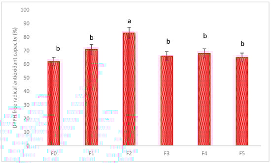 Likewise, the total phenolic compounds and total flavonoid compounds were increased in the F2 formulation, as HME has been a proven to enhance the beneficial compounds from plant materials [21,22]. Because of the strong correlation between the phenolic compounds and the antioxidant capacity [23], the DPPH antioxidant capacity was also significantly increased in the F2 formulation.