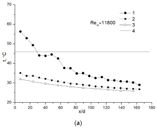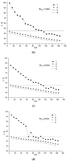 Figure 2 shows that, with an increase in Rein, the part of the calorimetric tube where convection is prevailing extends. When Rein ≈ 11,800 convection is prevailing region is observed from the beginning of the calorimetric tube until x/d ≈ 30–40 (Figure 2a,b). For the cases when Rein was increased to 23,000 (Figure 2b,c), it has extended further, i.e., until x/d ≈ 60–70.