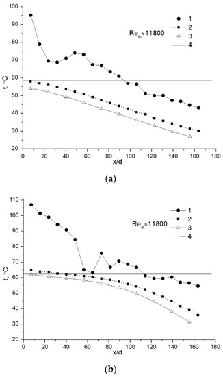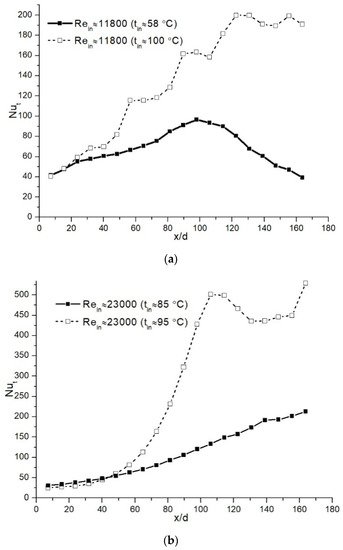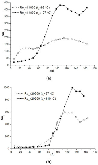 At Rein ≈ 23,000 for both inlet flue gas temperatures (Figure 2c,d), the heat transfer increases rather intensively with the distance of the tube (Figure 3b). For the lower inlet flue gas temperature, the heat transfer constantly increases until the end of the tube. For the higher inlet flue gas temperature, three zones of the Nut variation can be distinguished: the first one is from the beginning of the tube, where the heat transfer gradually increases until about x/d ≈ 50, the second one is from x/d > 50, when a rather sharp increase of heat transfer is observed, and the third one from x/d of about 110 when Nut starts to stabilize. Such intensification of heat transfer could be related with prevailing of the condensation due to a decrease in the flow temperature in whole cross-section below the dew point temperature.
