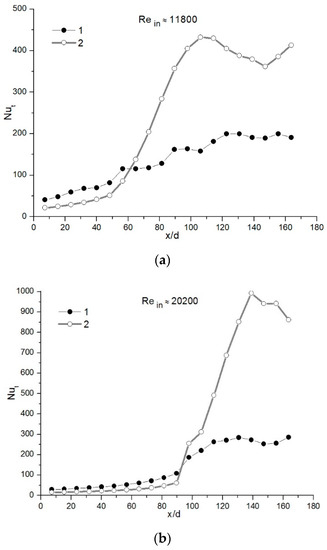 Variation of the total Nusselt number along the model of the condensing heat exchanger at a different water-vapor mass fraction but a constant Rein (a) Rein ≈ 11,800, (b) Rein ≈ 20,200: (1) mcd in ≈ 7% and (2) mcd in ≈ 17%.