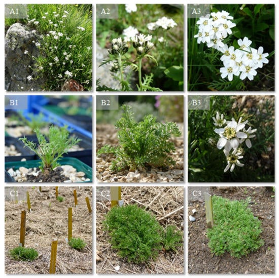 Achillea atrata L. from different locations. A: Natural habitat of A. atrata in the Southern Limestone Alps at an altitude of 1763 m a.s.l. (June 2019, A1). Side profile (A2) and close-up view (A3) of characteristic flowers with their black-edged bracts. B: A. atrata variants cultivated in Germany, under controlled conditions at 15 °C in the greenhouse, 3 months after germination (June 2018, B1). Overview of the field experiment in Germany at an altitude of 410 m a.s.l. with an average plant height of up to 7 cm (July 2019, B2). Close-up view of the flowers of the cultivated variety with 9 flower heads (⌀ 0.5 cm, September 2016, B3). C: Cultivation project in Switzerland at an altitude of 1200 m a.s.l. (July 2018, C1). A. atrata in the vegetative phase, with an average plant height of up to 10 cm and a plant width of up to 13 cm in the field experiment in Switzerland (July 2018, (C2) and August 2019 (C3).