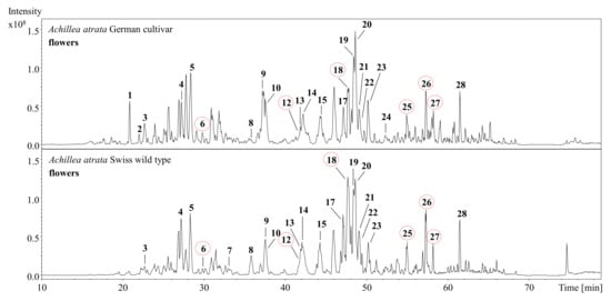 Comparison of total ion chromatograms of flower extracts from A. atrata variants cultivated in Germany and from the wild type grown in Switzerland. 1: Dimethyl-O-ellagic acid; 2: Syringic acid-O-hexoside; 3: Protocatechuic acid-O-hexoside; 4: Chlorogenic acid; 5: p-Coumaroyl acid derivative; 6: Apigenin-6,8-di-C-hexoside; 7: Schaftoside/ Isoschaftoside; 8: Quercetin-O-hexoside; 9: Dimethoxyflavanone derivative; 10: Formate adduct; 12: Dicaffeoylquinic acid-O-hexoside; 13: Mearnsetin-O-hexoside; 14: Luteolin-O-hexoside; 15: Isorhamnetin-O-hexoside; 17: Dimethoxy-myricetin-hexoside; 18: Apigenin-7-O-glucoside; 19–23: Dicaffeoylquinic acids; 24: Caffeoyl-feruloylquinic acid; 25: Luteolin; 26: Apigenin; 27: Centaureidin; 28: Nevadensin. Compounds exclusively detected in the flowers but not in the leaves are highlighted in red.