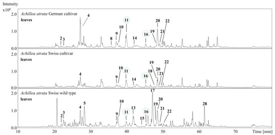 Comparison of total ion chromatograms of leaves extracts from A. atrata variants cultivated in Germany and Switzerland and from the wild type from Switzerland. 1: Dimethyl-O-ellagic acid; 2: Syringic acid-O-hexoside; 3: Protocatechuic acid-O-hexoside; 4: Chlorogenic acid; 5: p-Coumaroyl acid derivative; 7: Schaftoside/ Isoschaftoside; 8: Quercetin-O-hexoside; 9: Dimethoxyflavanone derivative; 10: Formate adduct; 11: Quercetin-3-O-rutinoside; 13: Mearnsetin-hexoside; 14: Luteolin-O-hexoside; 15: Isorhamnetin-O-hexoside; 16: Kaempferol-3-O-rutinoside; 17: Dimethoxy-myricetin-hexoside; 19–23: Dicaffeoylquinic acids; 24: Caffeoyl-feruloylquinic acid; 28: Nevadensin. Compounds exclusively detected in the leaves but not in flowers are highlighted in green.