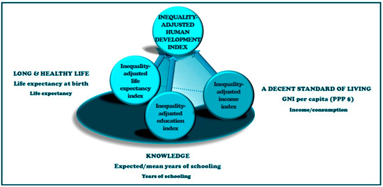 Both good health and well-being and general social cohesion and equality are the determinants of economic development in individual countries and their regions. More equitable societies tend to be characterized by greater progress in various aspects of their development. The measure is the Human Development Index HDI [10,11], developed by Pakistani economist Mahbub ul Haq, calculated for each country and first time reported by the United Nations Development Program (UNDP)’s Human Development Report Office [3,12,13] in 1990. In 2010 it was recognized that while HDI stands for an index of “potential” human development (corresponding to the maximum level of HDI), it could be achieved if there were no social inequalities between individual countries and people in these countries. Since such an assumption does not correspond to the truth, an Inequality-adjusted Human Development Index IHDI was introduced [14], which, taking into account inequality, gives the actual level of human development (Figure 2) [1].