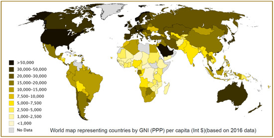 Geographical distribution of a decent standard of living index: gross national income (GNI) per capita at purchasing power parity (PPP) (in international dollars).