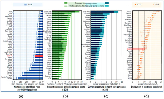 OECD countries compared in terms of (a) mortality rates per 100,000 inhabitants by a heart attack and other ischemic heart diseases in 2018; (b,c) health expenditure in 2018 per capita; (d) changes in employment in the health and social work as a share in total employment in 2000–2017.