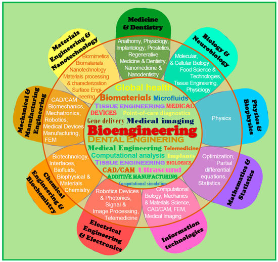 Achievements in the field of implantology, prosthetics, tissue engineering, and natural organ transplants, serving specific patients directly, setting the latest trends in medicine and interventional and regenerative dentistry, have their sources in the deep knowledge and experience of doctors and biologists, what is obvious. However, the enormous achievements in the field of engineering, generally referred to as bioengineering, with the participation of medical and dental engineering, including, among others, advanced modeling, computational science, and computer-aided engineering design, materials engineering, materials process technologies, and manufacturing engineering together with additive technologies, nanotechnology, and surface engineering (Figure 13). Bioengineering is richly collaborative and interdisciplinary and focuses on integrative applications and solves problems left unanswered by engineering and physical/life science disciplines [131,132]. The diagram shows the multidisciplinary nature of this engineering discipline in the form of a multicoloured flower. Each of the petals corresponds to a different area of knowledge contributing to it. In the central part, various areas of interest in science and engineering are specified as examples.