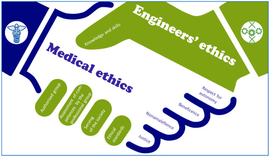 Bioengineering tasks pose special challenges for the engineering staff of many specialties indicated in the diagram, which should meet, on the one hand, the expectations of doctors serving the avant-garde areas of medicine, regenerative dentistry, tissue engineering and corresponding to the challenges related to patients health, and on the other hand, fulfill the principles of the current development stage of Industry 4.0 [133,134,135,136,137,138,139] is very responsible research. According to complex and advanced original technologies, the most avant-garde trends concern the offering of personalized medical devices manufactured according to the patient’s individual anatomical features and newer and newer biomaterials used in implantable devices. These issues are among the most avant-garde and constantly developing engineering problems of great importance for the development of medicine and dentistry and have been the authors’ scientific interest for many years [9,140,141,142,143,144,145,146,147,148,149,150,151,152,153,154,155,156,157,158,159]. The collaboration of biomedical and dental engineers with doctors in patients’ service and assisting them in removing or at least alleviating the disease’s effects obligates doctors and engineers with a specific ethical approach. As part of the obligation to systematically expand their knowledge, this cooperation imposes on doctors to follow the latest scientific achievements to use them for their own patients. The far-reaching dependence of modern medicine and dentistry on technical progress and engineering achievements requires doctors to trust engineers and rely on their experience and knowledge and their entrepreneurship and initiative. From this, these particular ethical requirements arise, which must be met by every engineer working with a doctor, even though he/she is not officially obliged to take any oaths. However, this is an undisputed and unconditional moral imperative of an engineer. It is a schematic view in the form of the oppression of two hands symbolizing two different communities’ cooperation, shown in Figure 14 [57,58].