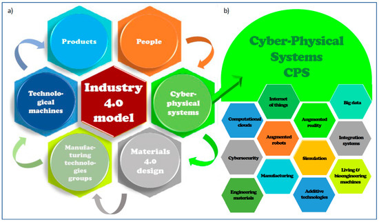 Diagram of (a) augmented elements of the holistic Industry 4.0 model; (b) extended scope of cyber-physical systems.