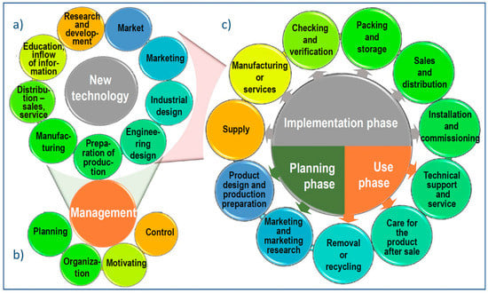 Diagram of the (a) interdependence of factors related to the introduction of a new product and a new technology to the market, (b) with production management, (c) and the product life cycle included in the quality loop.