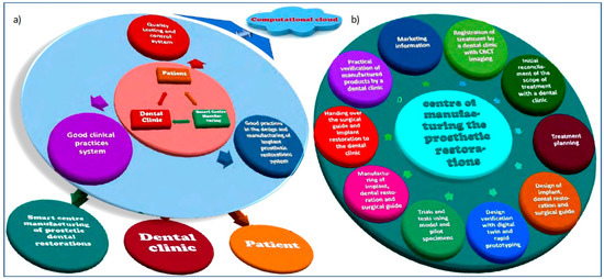 Diagram (a) relationship between the patient’s expectations, design, and manufacturing capabilities of the center for the manufacture of dental prosthetic restorations and (b) the medical tasks of a dental clinic according to the concept of Dentistry 4.0.