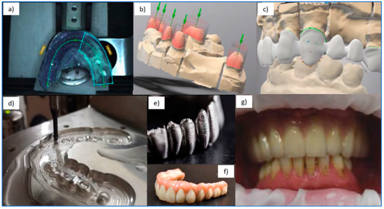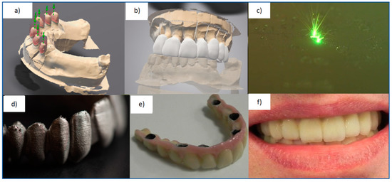 As the manufacturing centers for prosthetic restorations belong to micro or small enterprises, and the production is unique and personalized, automated guided AGVs are usually not used. Still, smart entry and exit logistics are applied. These centers collaborate with numerous dental clinics, from where they receive electronic data on the diagnosis of individual patients, including CBCT photos, via the network or cloud computing. On this basis, prosthetic restorations, models, and templates are designed and manufactured through computer-aided design CAD and production planning CAPP with the use of centers numerically controlled CNC, machines for additive manufacturing, e.g., the selective laser sintering SLS method, as well as surface coating, including internal surface coating, by atomic layer deposition ALD, often involving robots. A cyber-physical system enables creating a value chain. Sensor systems of manufacturing machines identify the factors of creating value and monitor manufacturing processes, and smart data activates the appropriate actuators. Prosthetic restorations from essence are personalized according to the principle of demand in every case so that a prototype is always produced. Still, it can be verified in virtual reality using the method of “digital twins”. It is also possible to apply artificial intelligence and machine learning methods, which enable machines to be smart to react to various production situations.