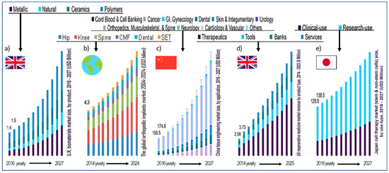 The modern level of medicine and dentistry, as its special area, is currently closely related to the development of numerous technical means and medical devices, which became possible thanks to the dynamic development of bioengineering along with medical, dental, and tissue engineering regenerative medicine and cell therapies. Both diagnostics and complex interventional procedures require very advanced medical devices. The development of these areas of knowledge, usually engineering and technical, is now a strong determinant of the development of medicine and medical science in general. Devices of this type are subject to all the industrial development rules; therefore, it is not surprising that these areas reach the Industry 4.0 stage. It is a necessity on the one hand and a challenge on the other. The development of the industry is based on the development of production, which, in turn, cannot exist without the use of engineering materials. In medical and dental devices, a very specific set of properties of the materials used is required, especially biocompatibility and ensuring the absence of adverse interactions with living tissues of the human body, and this group of materials is called biomedical materials or simply biomaterials. It is easy to demonstrate the dependence of the development of this group of materials and related global markets with the level of care for the level of healthcare.