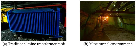 At present, dry-type transformer instead of oil immersed transformer is mostly used in places such as mine tunnels. The reason is that the insulation of the traditional oil immersed transformer is low ignition temperature and flammable, and the oil immersed transformer has no explosion-proof capability. Compared with oil immersed transformer, dry-type transformer is cooled by air and is flame retardant, but it is not non-combustible. If the temperature exceeds the limit, it will still catch fire in case of open fire. There are other inherent disadvantages such as the insulation and heat capacity of the air which when used for insulation and heat dissipation are far less than that of transformer oil. The cooling efficiency is low and the heat dissipation effect is poor, and it often needs to add a fan for auxiliary cooling. In addition, more core and coil materials are used because of the low winding current density which is about 1 A/mm2 generally. The effective materials cannot be fully utilized, and the load loss is only 3–5 times the no-load loss, so the performance is lower than that of oil immersed transformer with the same capacity. Mining flameproof transformer often uses corrugated shell to achieve heat dissipation requirements by expanding the surface area (see Figure 1a), which leads to large volume, poor overload capacity, difficulty in making large capacity and greater cost. The mine tunnels are humid and dusty (see Figure 1b), so that the surface of transformer body easily attracts coal dust to form a layer of wet mud, which worsens the poor heat dissipation capacity and leads to the decline of transformer performance. Therefore, the transformer in mine tunnels is frequently damaged with high failure rate.