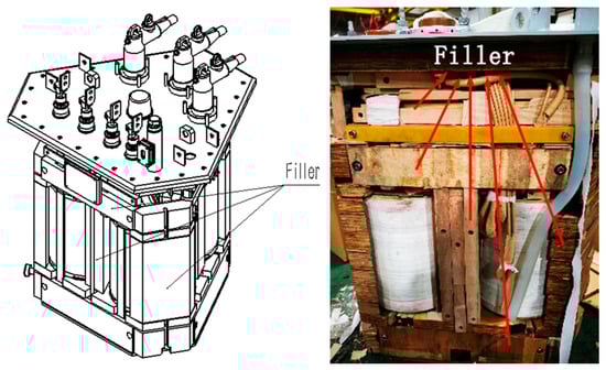 In order to form a space conducive to the flow of the evaporative cooling working medium to the top heat exchanger and the condensation reflux, the filler should surround the coil and core. The gap between filler and heat source presents a vertical narrow shape. The filler structure is shown in Figure 8. In the process of filling installation, the mechanical strength should be ensured, and the original state should be kept when the coolant is boiling. The filler structure can greatly reduce the consumption of fluorocarbon coolant on the premise of ensuring the insulation performance between the core and the winding. According to the heat transfer calculation and the actual filling effect, the consumption of working fluid was reduced from 191 kg to 130 kg, saving 61 kg coolant, which means saving 12,200 yuan (about $1897), and the total cost of coolant is reduced by 31.9%. The volume of fluorocarbon working fluid is about half of the original transformer oil.
