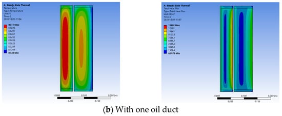 According to the simulation diagram Figure 9, even if there is no oil duct between the high- and low-voltage coils, the maximum coil hot spot temperature is 96.886 °C, which can meet the requirements of IEC 60076.2 temperature rise limit. However, the traditional oil immersed self-cooling distribution transformer with the same capacity needs to arrange three oil ducts in total. In this design, only one oil duct is arranged between the high- and low-voltage coils, which reduces the complexity of coil winding process.