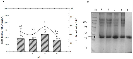 Effect of pH on rTBL-1 and biomass production. (A) Production in a batch system over 96 h with G99, (B) SDS-PAGE analysis of fermentation samples (96 h) at different pH. Lane 1, pH 3; lane 2, pH 4; lane 3, pH 5; lane 4, pH 6; lane 5, purified rTBL-1. M, molecular weight marker. rTBL-1 band is indicated by arrow (b). Error bars correspond to the standard deviation of three independent determinations. Different letters represent significant differences (p ≤ 0.05; Tukey, SAS System Version 9) between treatments for wet cell weight or for rTBL-1.