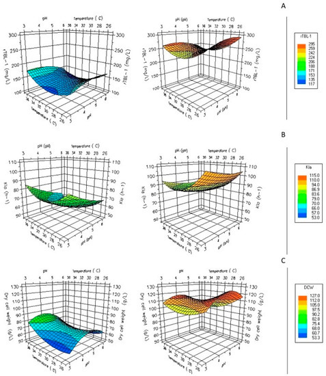 The kLa increased accordingly with superficial gas velocity and decreased with cellular density. The increase in initial kLa from 65 h−1 to 115 h−1 led to a 4.6-fold increase in rTBL-1′s final concentration (Figure 4B). On the other hand, experiments were also performed with controlled dissolved oxygen (DO). Setting an optimal kLa instead of controlled DO suggests that kLa is a good parameter for the rTBL-1 production using crude glycerol in P. pastoris fermentations and it is necessary considering it in bioprocess scale-ups. A second-order polynomial model provided the best fit to the experimental data obtained for rTBL-1: