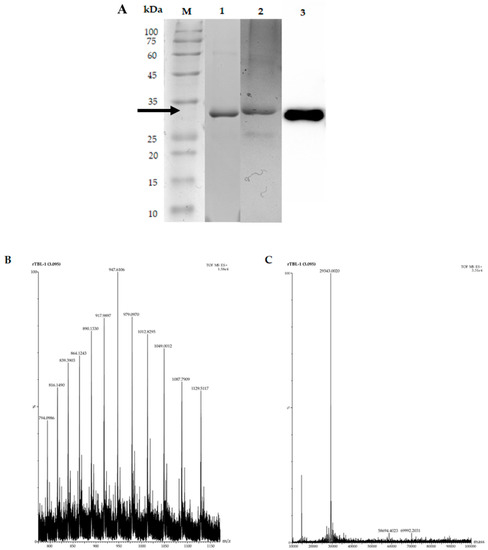 Figure 5 shows the rTBL-1 electrophoresis detection and mass spectra after the optimization process using G65 as substrate. SDS-PAGE showed the presence of a single band of ~30 that was stained by Schiff-PAS and identified by Western blot (Figure 5A). The rTBL-1 mass spectrometry (UHPLC–ESI–QTOF/MS) at 3.095 min is shown with a major peak at 947.6 m/z (Figure 5B). The deconvolution spectrum of this peak showed a single peak with a molecular mass of 29,343.0020 Da (Figure 5C).