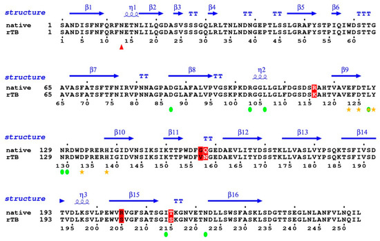 Coverage percentage of identity between the mature sequences of rTBL-1 and the Tepary bean native lectin. Sequences were analyzed by ESPript Versión 3.0 (Lyon, France) (http://espript.ibcp.fr/ESPript/ESPript/ last access on February 2021). Red triangle shows the glycosylation site; yellow stars show amino acids involved in metal coordination; green circles show the carbohydrate binding site. Changes are shown in red color.